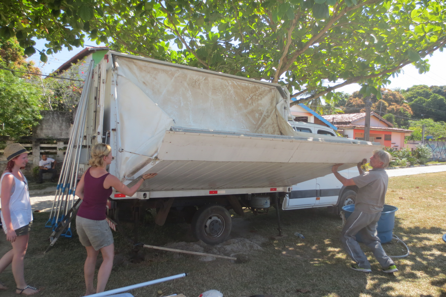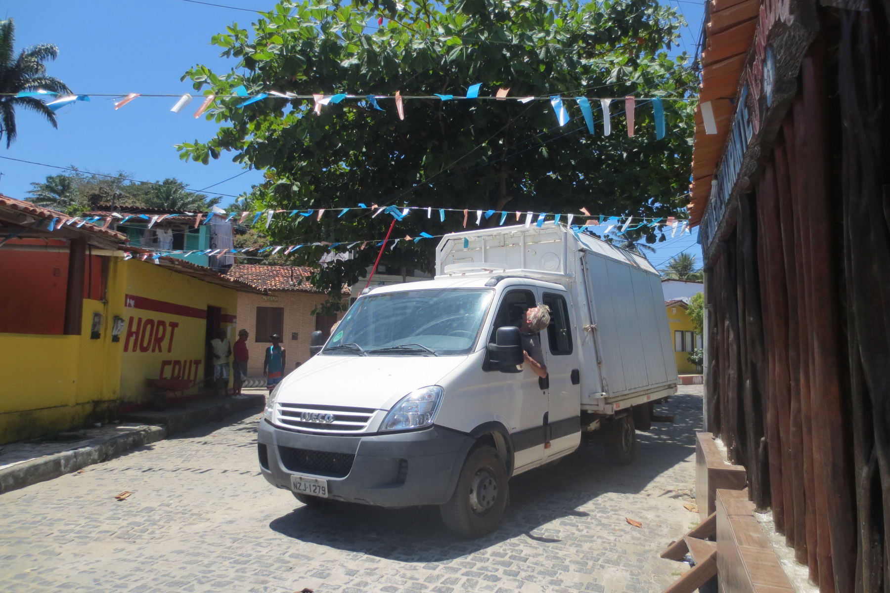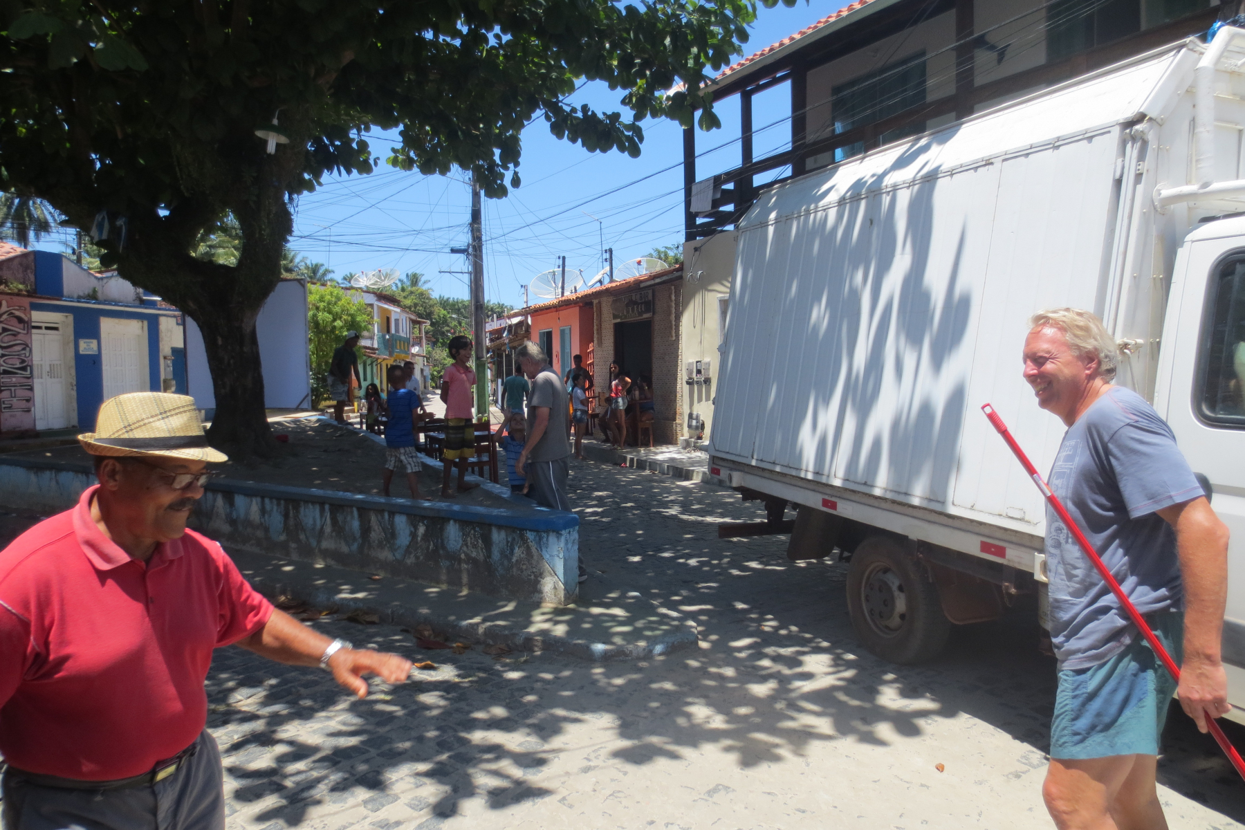 Achims ‘andere Idee’ ist ein Anlegeplatz etwa zehn Kilometer weiter westlich mit höherem Uferrand, wo auch andere Lieferboote regelmäßig schwere Fracht wie Ziegel oder Zement auf der Insel abladen. Als wir dort ankommen, wird gerade ein Schiff entladen. Die Arbeiter wundern sich sehr über unsere Fracht. Es gibt nämlich auf Boipeba keine Fahrzeuge, also eigentlich auch keine Straßen, nur Feldwege, die von wenigen Traktoren für die Landwirtschaft genutzt werden. Ansonsten erledigen Pferdekarren die Zulieferung der Privathaushalte, der kleinen Geschäfte und der Restaurants. Nachdem geklärt ist, wer wir sind und dass wir eine Genehmigung haben unseren Behandlungs-LKW auf die Insel zu bringen, hagelt es gleich erste Terminanfragen und ob wir auch Wurzelbehandlungen durchführen und wie lange wir bleiben werden und wo man sich für einen Termin anmelden muss….
