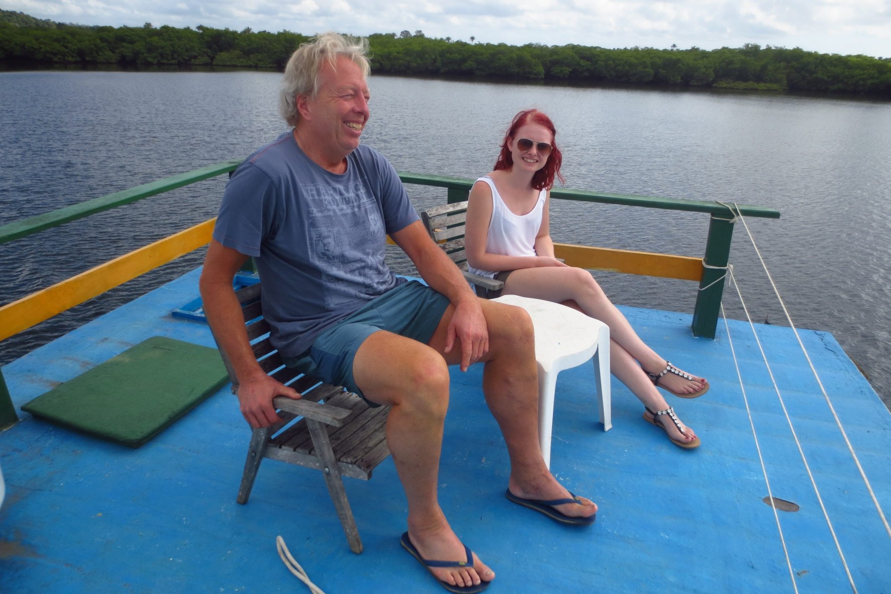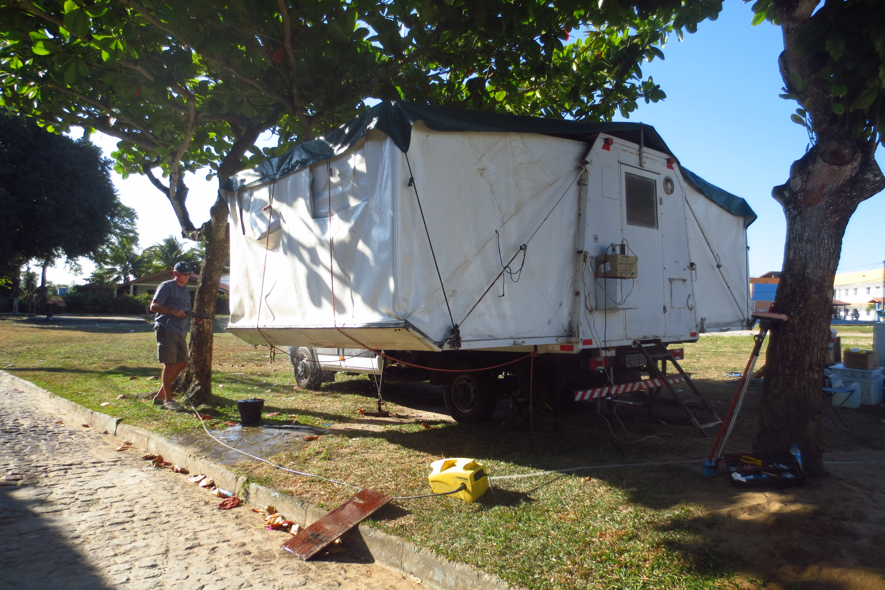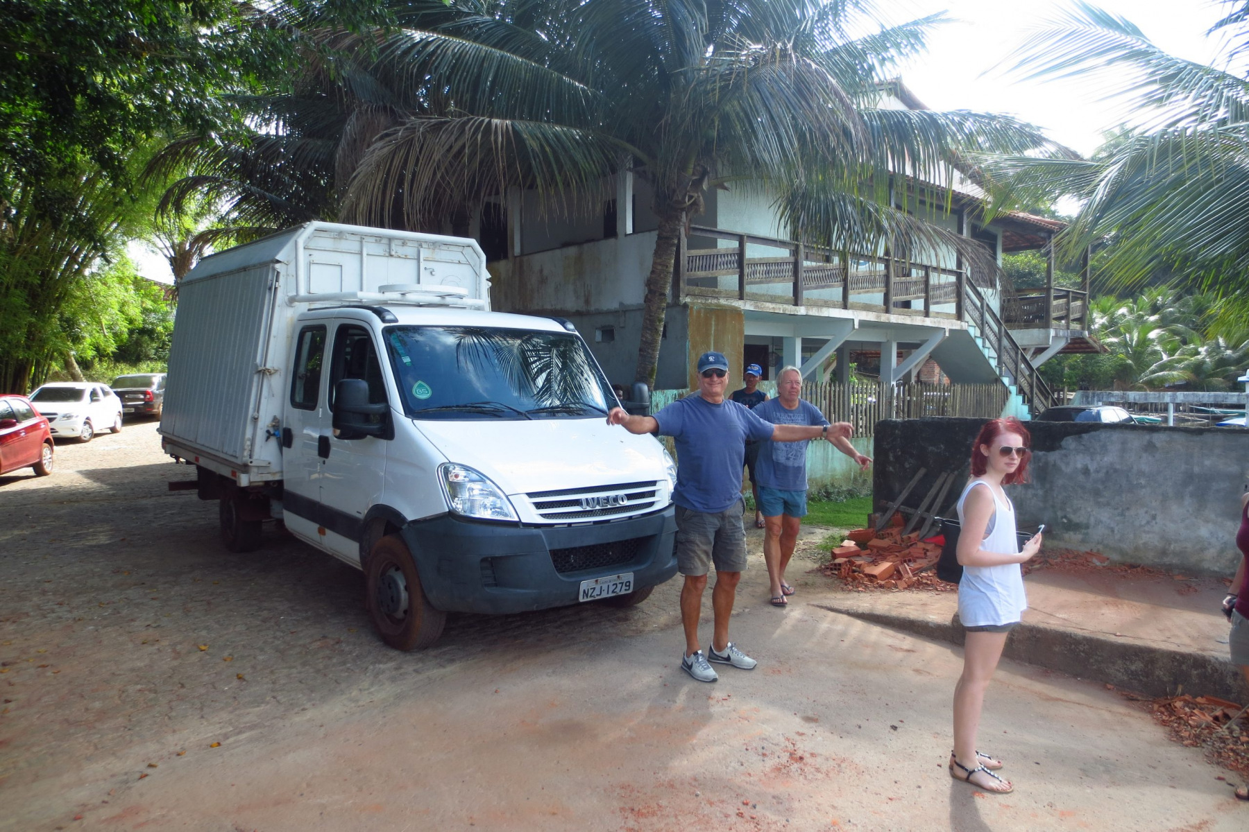 Achims ‘andere Idee’ ist ein Anlegeplatz etwa zehn Kilometer weiter westlich mit höherem Uferrand, wo auch andere Lieferboote regelmäßig schwere Fracht wie Ziegel oder Zement auf der Insel abladen. Als wir dort ankommen, wird gerade ein Schiff entladen. Die Arbeiter wundern sich sehr über unsere Fracht. Es gibt nämlich auf Boipeba keine Fahrzeuge, also eigentlich auch keine Straßen, nur Feldwege, die von wenigen Traktoren für die Landwirtschaft genutzt werden. Ansonsten erledigen Pferdekarren die Zulieferung der Privathaushalte, der kleinen Geschäfte und der Restaurants. Nachdem geklärt ist, wer wir sind und dass wir eine Genehmigung haben unseren Behandlungs-LKW auf die Insel zu bringen, hagelt es gleich erste Terminanfragen und ob wir auch Wurzelbehandlungen durchführen und wie lange wir bleiben werden und wo man sich für einen Termin anmelden muss….