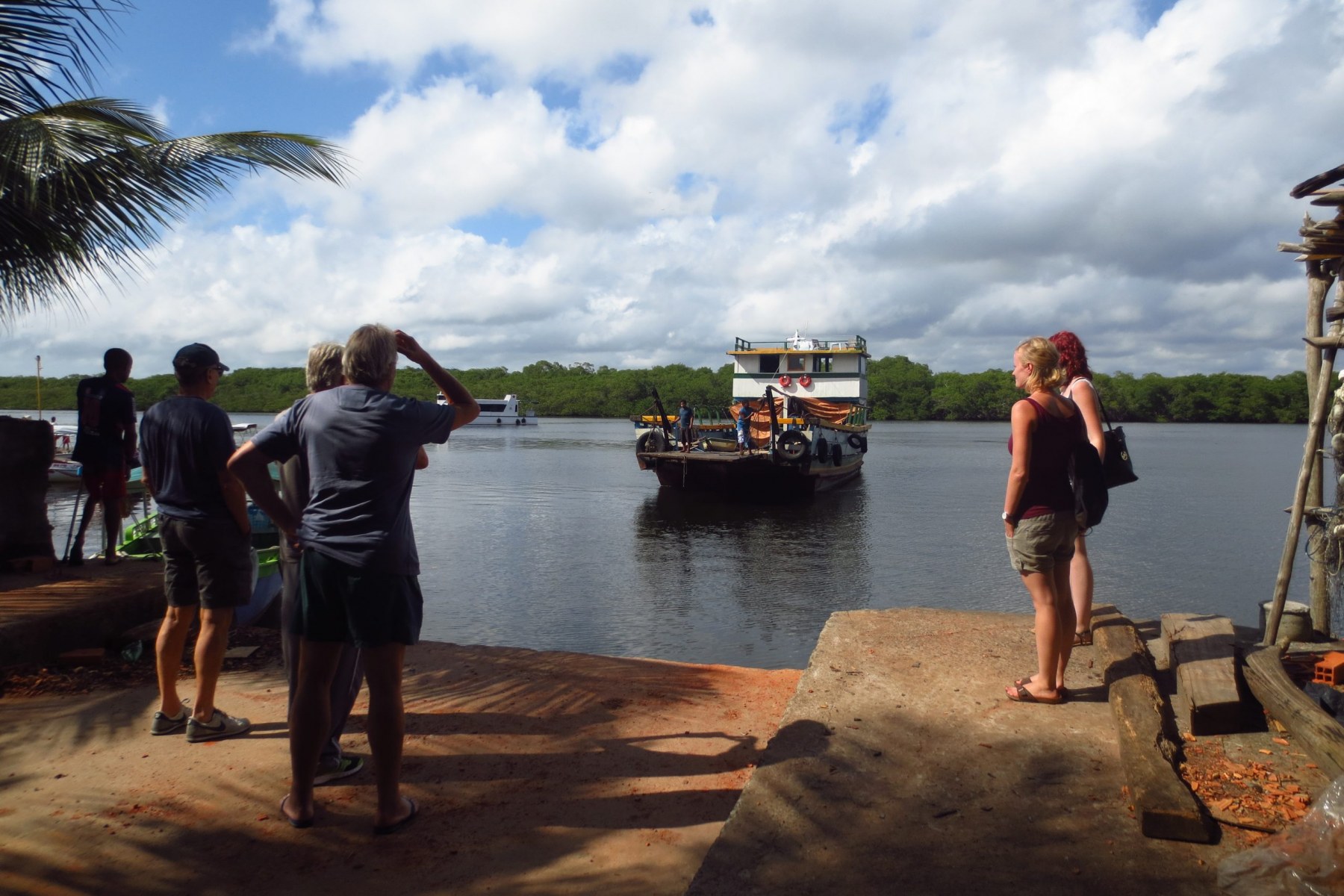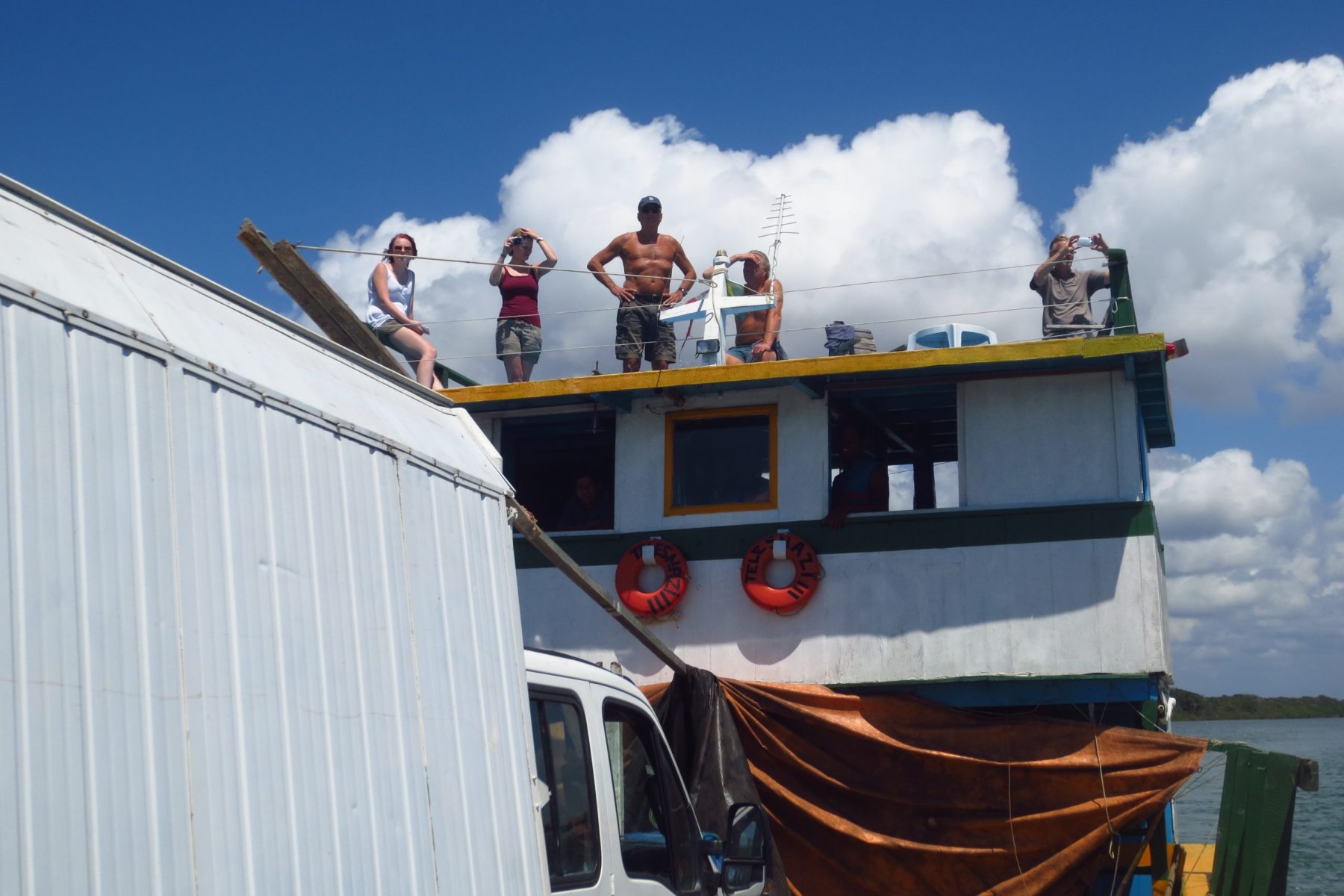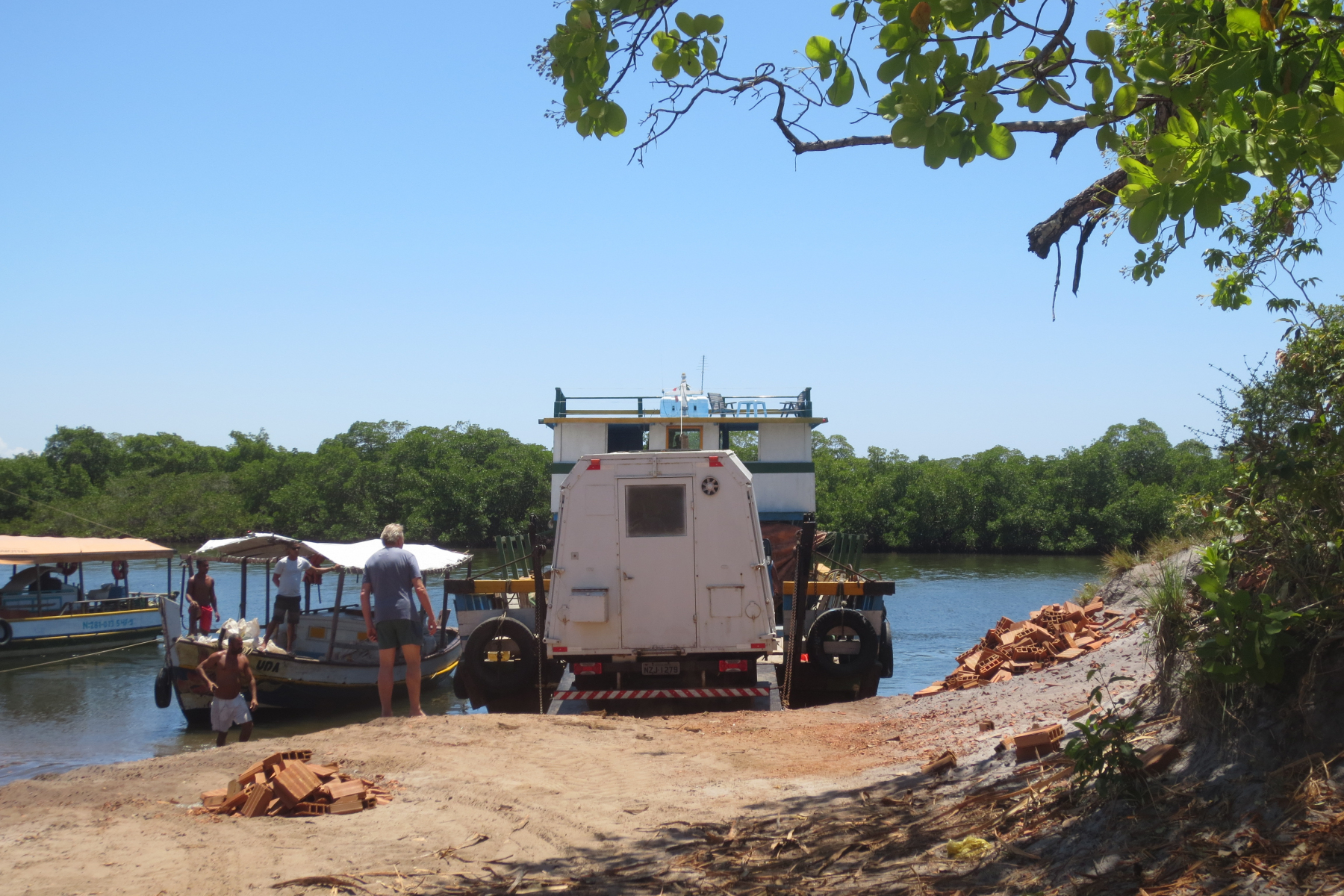Alles wunderbar – wir jubeln! Wir legen ab zur dreistündigen Überfahrt bei gleißendem Licht durch den von Mangroven gesäumten Meeresarm. Unser Kapitän begrüßt uns mit einem herzlichen Lächeln und vielen schwarzen Zahnlücken. Er ist ein erfahrener, alter Hase, der jede Sandbank genau kennt. Das gleißende Licht täuscht; obwohl der Oktober ein vergleichsweise milder Frühjahrsmonat in Brasilien ist, holen wir uns alle einen leichten Sonnenbrand und sind froh, als unser Zielort Boipeba Velha endlich in Sichtweite ist. Der Ort liegt direkt an einem langen Palmen-Strand, eine Art Hafenkai gibt es nicht. Geplant ist, die Rampe der Fähre am flachen Ufer ab zu senken und das DM über den festen Strand auf den nahe gelegenen Dorfplatz zu fahren. Aber schnell ist klar, dass das so nicht gelingen wird: Die Fähre kommt nicht nah genug ans Ufer, die Rampe ist zu kurz, der Winkel zu spitz. Das DM würde bei der Abfahrt aufsetzen.