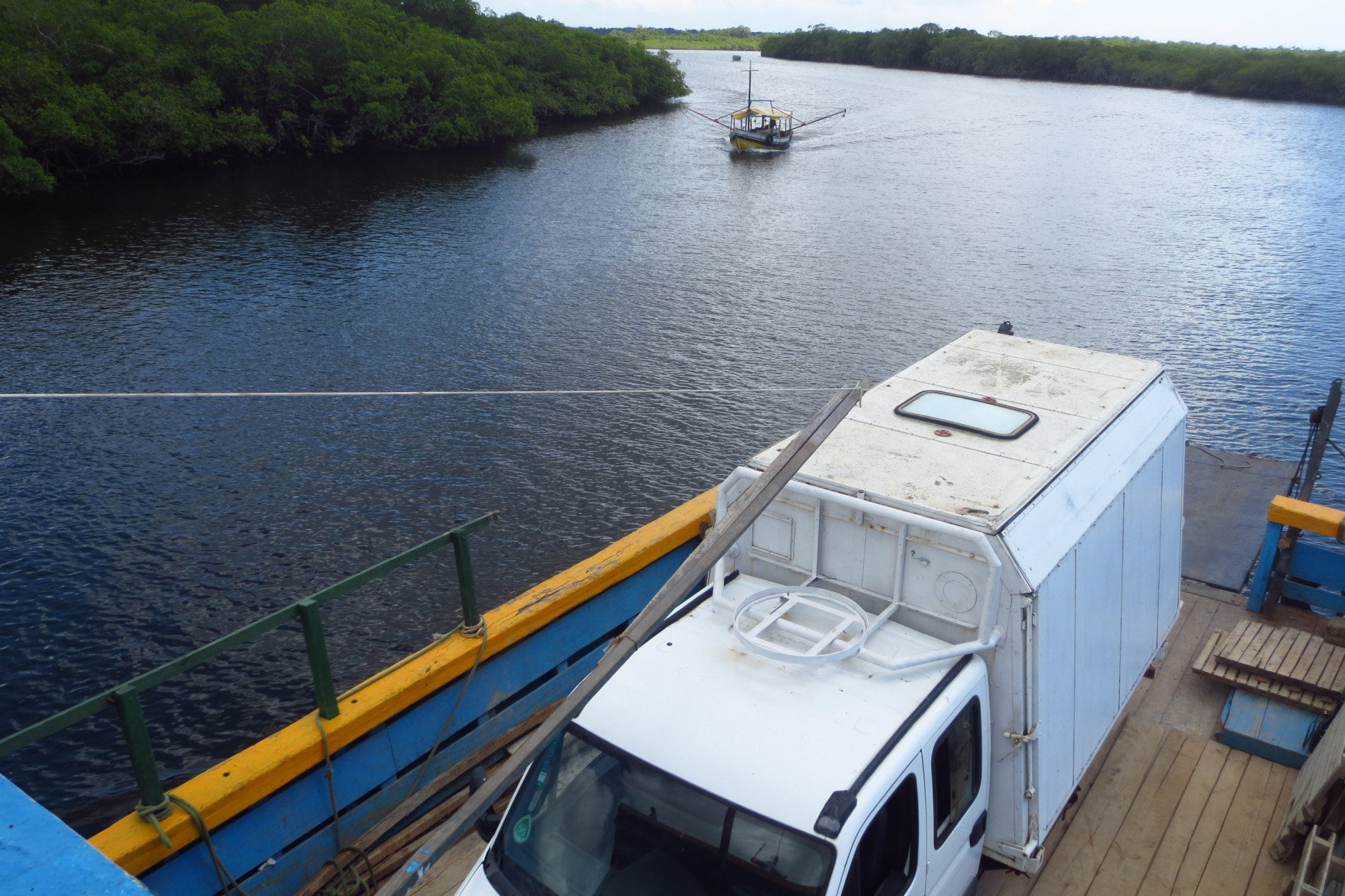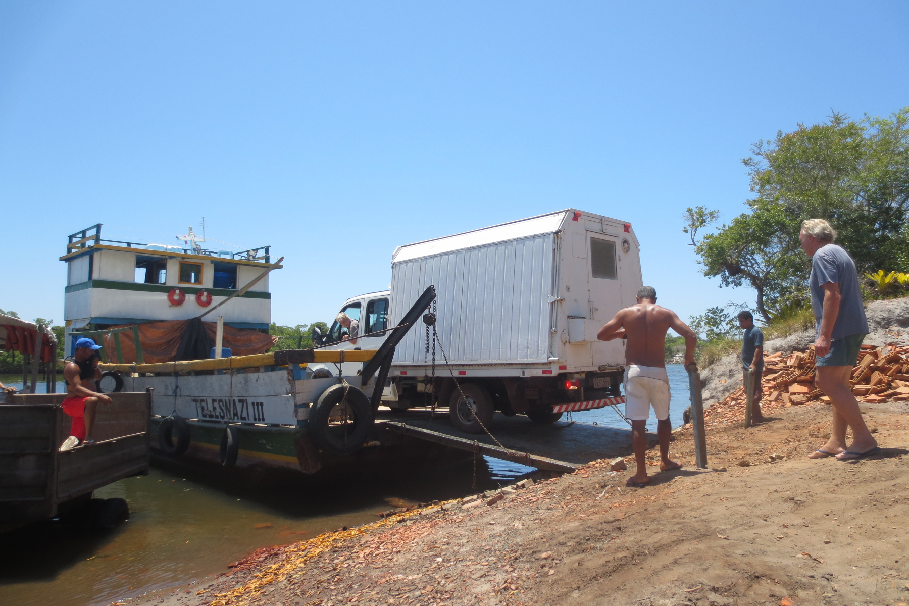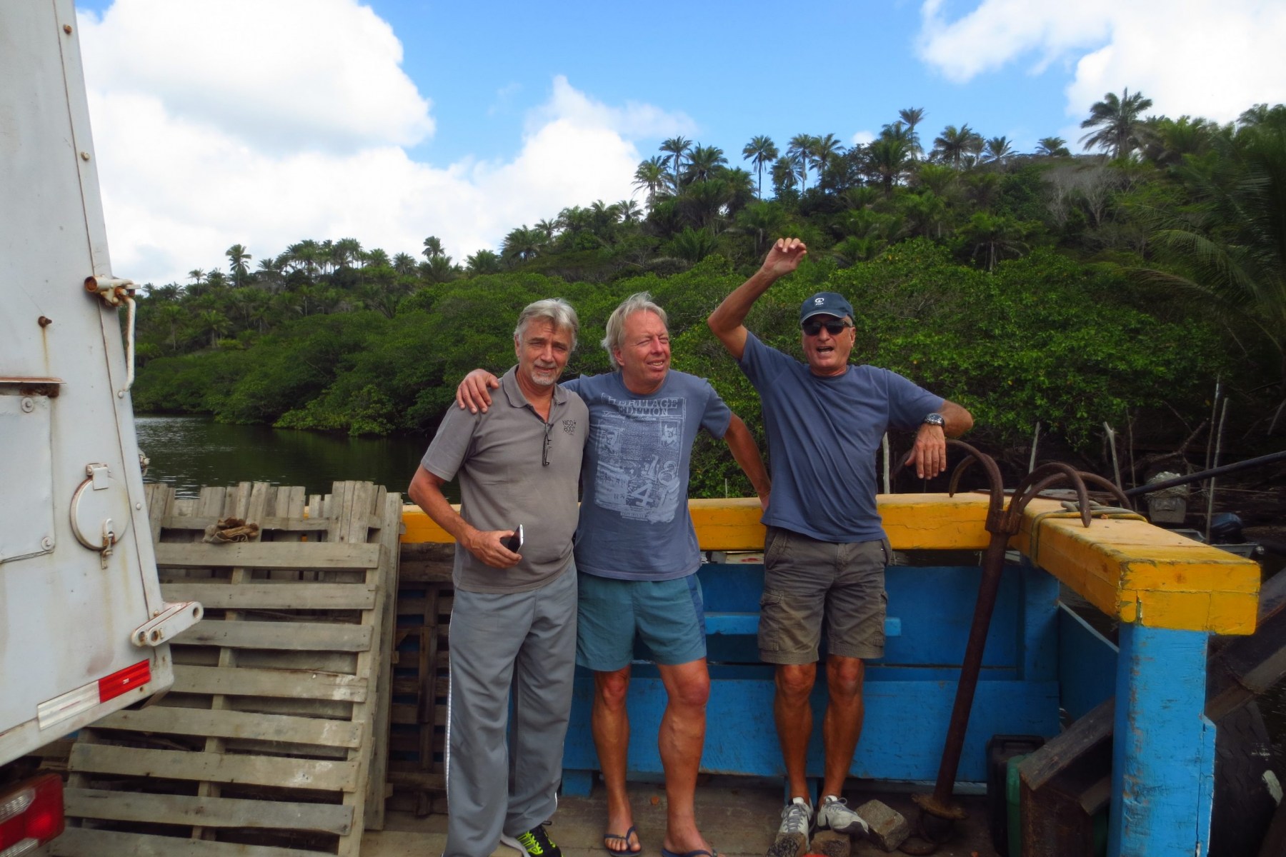 Wochen vorher hat Gerd Pfeffer bereits eine spezielle Fähre organisiert, die uns in dem einzigen Hafen abholt, von dem man Boipeba per Schiff erreichen kann. Der Hafenort heißt Torrinhas und liegt wiederum auf der Insel Cairu, zu der aber eine kleine Brücke vom Festland hinüber führt. Die Fahrt von Valenca bis Torrinhas schätzt Gerd auf drei Stunden, die letzten 20 Kilometer führen allerdings nur noch über Erdstraßen, die in Brasilien tückisch sein können! Wir sollten pünktlich um acht Uhr morgens in Torrinhas ankommen, weil der Tidenhub dann am höchsten steht. Der Meeresarm, der Cairu mit Boipeba verbindet, hat nur geringen Tiefgang und unser DM wiegt mit Ladung ca. 3,5 Tonnen.
