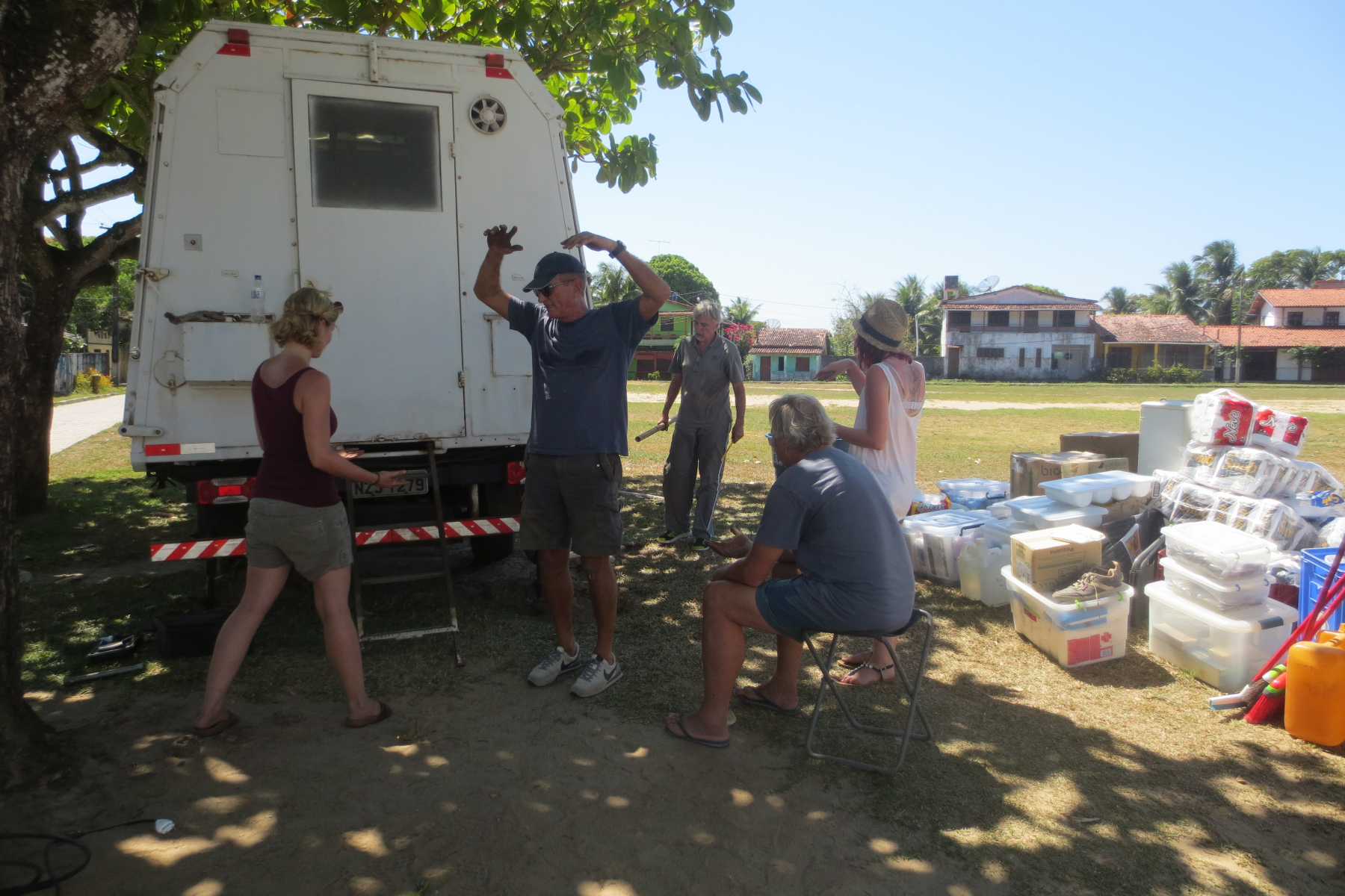 Ich bin nicht aus dem zahnmedizinischen Berufsumfeld, aber seit vielen Jahren Schatzmeisterin des Vereins und Lebenspartnerin von Utz Wagner, unserem ersten Vorsitzenden. Um so mehr habe ich mich gefreut, dass ich nach langer Zeit mal wieder „dabei sein“ durfte! Zusammen mit Jörg Schmoll, Carolin Lange und Michaela Weber waren wir das erste Team in diesem Einsatzzyklus der AZB. Das Dentomobil (DM) musste auf die kleine Insel Boipeba, etwa 200 km südlich von Salvador/Bahia gebracht und dort für die zahnärztlichen Behandlungen aufgebaut werden.