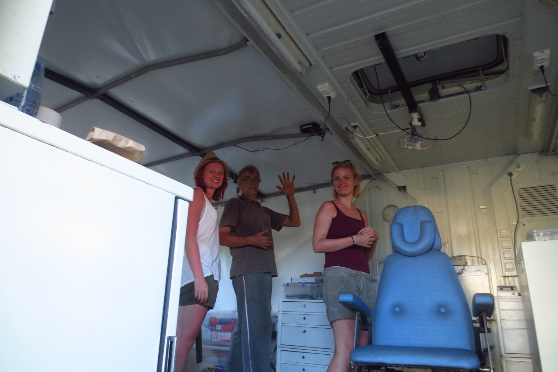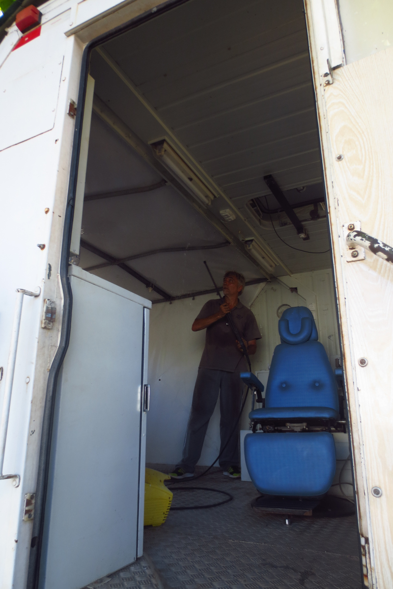 Mit offenen Flügeln ist der Innenraum drei mal so groß und es entsteht ein sehr geräumiges und helles „Behandlungszimmer“. Nur in der Mitte des Laderaumes ist eine einfache Zahnarzteinheit fest installiert. Rechts und links davon kann auf einer Art Liegestühlen flexibel behandelt werden. Sämtliches Behandlungsbesteck, Geräte, Beleuchtung, Medikamente, Anästhetika etc. werden in schweren, abschließbaren Metallkommoden transportiert, wie sie die Armee benutzt. Außerdem gibt es bei einem längeren Einsatz, wie diesem, einen sehr großen Vorrat an Papierrollen, Handschuhen und Reinigungsmitteln. Bis auf den fest installierten Stuhl müssen wir das DM zu aller erst komplett leer räumen, um die schweren Seitenflügel von innen mit einem Metallgerüst zu stützen. Danach werden mit dem Kärcher die Innenwände und Böden gründlich gesäubert, später auch die Außenwände. Auf dem Dach des Fahrerhauses stellen wir unseren großen Wassercontainer auf, schließen den Schlauch an und lassen schon mal ordentlich laufen, denn es dauert, bis der Container voll ist. Unter dem DM verstauen wir den Kompressor.